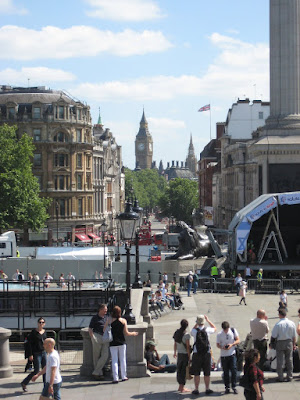 View of Trafalgar Square, Big Ben and Parliament from the steps of the National Gallery.